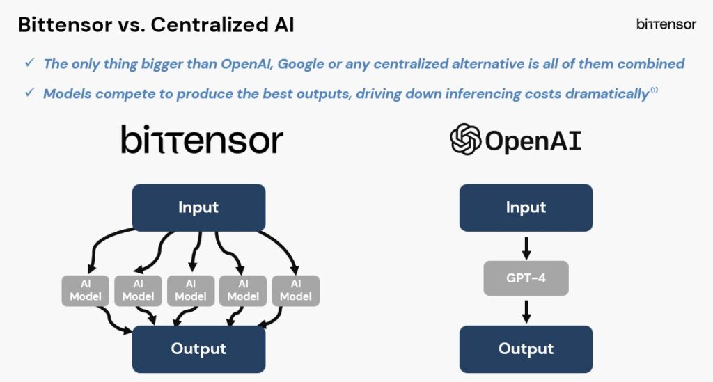 Bittensorは、従来の中央集権的AI開発から脱却し、誰でもAI学習に貢献できる分散型ネットワークの実現を目指しています。これは、GoogleやOpenAIのような大手企業だけでなく、個人や中小開発者にもAIの恩恵を開放することを意味します。