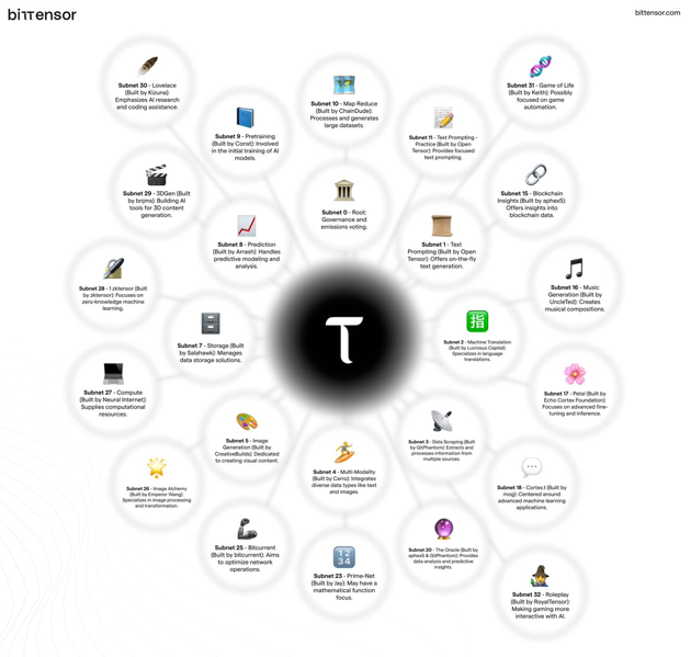 Bittensorでは、AIタスクを「32のサブネット(Subnets)」に分類し、それぞれに異なる役割を持たせています。