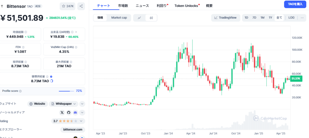 現在、AIとブロックチェーンの融合領域で急速に注目を集めているのが、仮想通貨 Bittensor(TAO) です。
