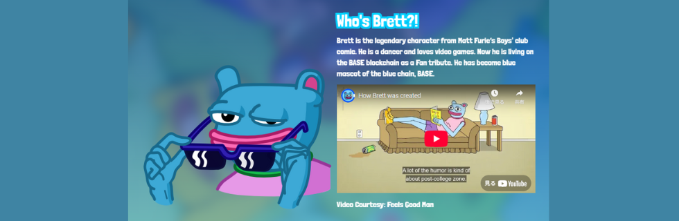 BRETTは、米国の人気コミック「Boys Club」に登場するキャラクターをモチーフにしたミームコインであり、世界的に有名な PEPE(ペペ) の“親友キャラ”として誕生しました。