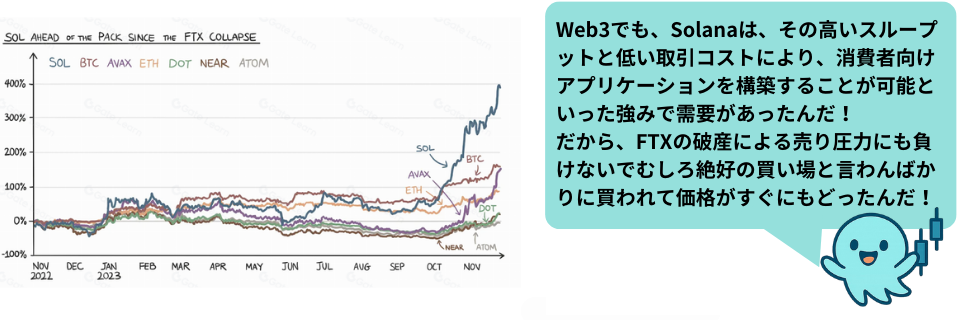 それでも2023年後半からはGoogle Cloudのソラナノードエンジン提供、Visa・Shopifyとの提携、Solana Payの普及といったポジティブニュースが続き、価格は再び上昇トレンドへ。今では「イーサリアムを超えるのでは?」と期待する声も増えています。