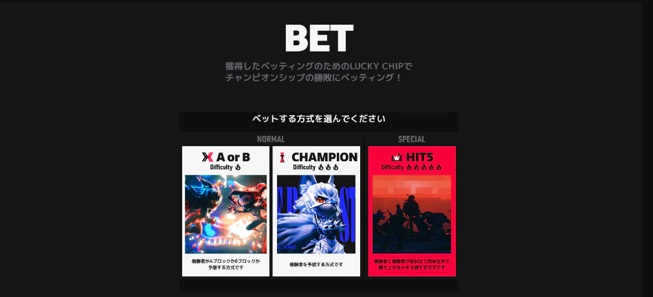 | BETTING | 大会の勝敗予想などで報酬を得られる仕組み |