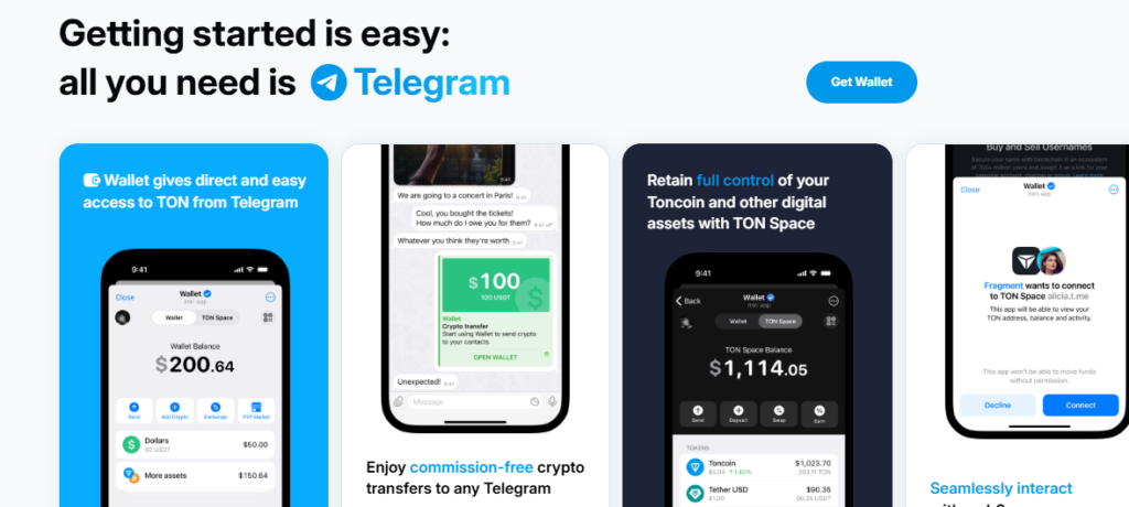 TONの最もユニークな特徴の一つは、Telegramとのシームレスな統合にあります。2022年より、Telegram内で使用可能な@walletボットを通じて、ユーザーはTONを送受信できるようになりました。これにより、初心者でも簡単に仮想通貨の送金ができるようになっています。